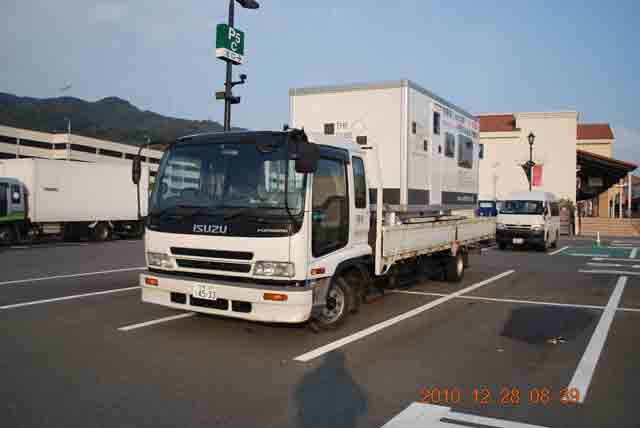 DSC_0452.jpg12月26日に出発して、御殿場に戻ったのが30日の午後でした。走りに走って2500キロほど走りました。一時間走っては一時間休む。というような感じで、のんびり行ってきました。モバイルキャビンは目立つだけにサービスエリアで声をかけられ、パンフレットをお渡ししました。現在日本は寒波にみまわれて九州地方も今年は雪になやまさせれいるようで、自分が行った時にも雪に降られて、太宰府あたりは雪国のような景色でした。4トン車なので音楽も聴けず、ラジオを聞きながら走ったのですが、普段聞いているニッポン放送も入らなくて、九州地方では、RKBラジオを聞いていたのですが、、、平日18時30分くらいから始まる、とっておきの夜なのだ、という番組がおもしろく、特にパーソナリティの女性のテンポというか、間というか、方言の聞き心地がとても楽しくファンになりました。